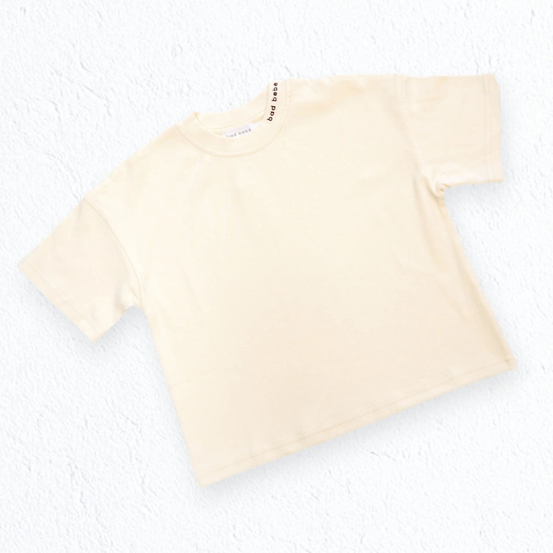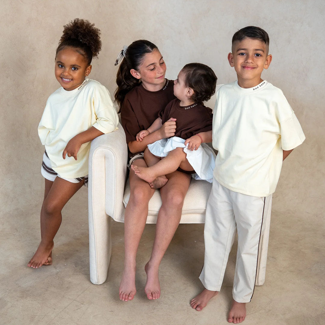 An elevated everyday essential crafted from ultra-soft 100% cotton. Finished with subtle bad bebé embroidery at the collar, this breathable tee is designed for comfort with a refined edge. Available from 3–6 months to 8/9 years. Oversized fit — size down for a slimmer look. Pairs effortlessly with the Going Viral Bubble Skirt or Rule Breaker Shorts.