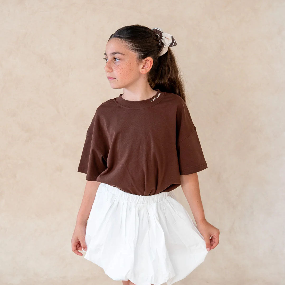 An elevated everyday essential crafted from ultra-soft 100% cotton. Finished with subtle bad bebé embroidery at the collar, this breathable tee is designed for comfort with a refined edge. Available from 3–6 months to 8/9 years. Oversized fit — size down for a slimmer look. Pairs effortlessly with the Going Viral Bubble Skirt or Rule Breaker Shorts.