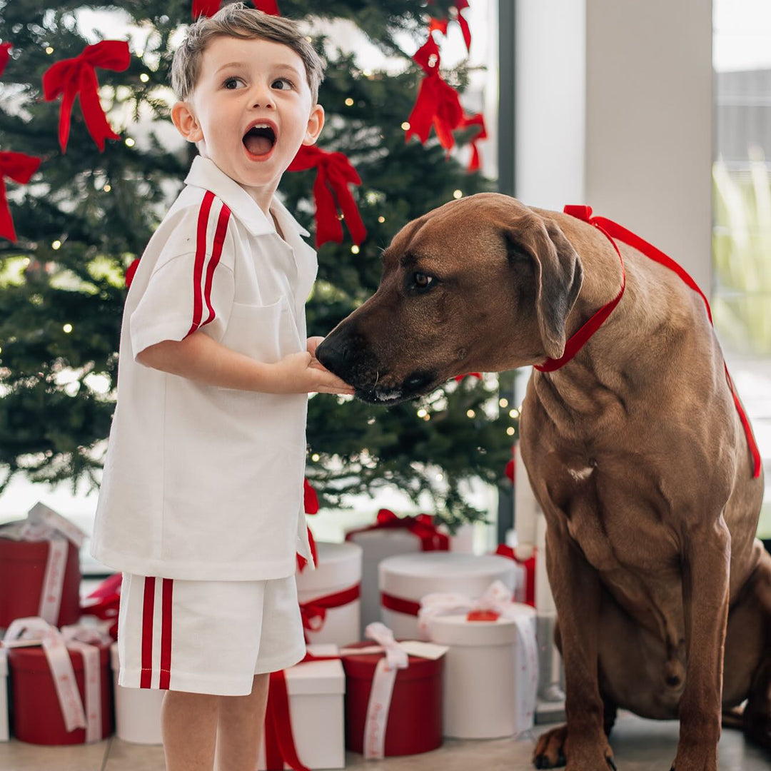Keep him looking cool and put-together in our boys’ matching shirt and shorts set, accented with classic red details. Crafted from a breathable cotton–linen blend for all-day comfort and easy wear. Ideal for special occasions or warm days out, offering a timeless and polished style.