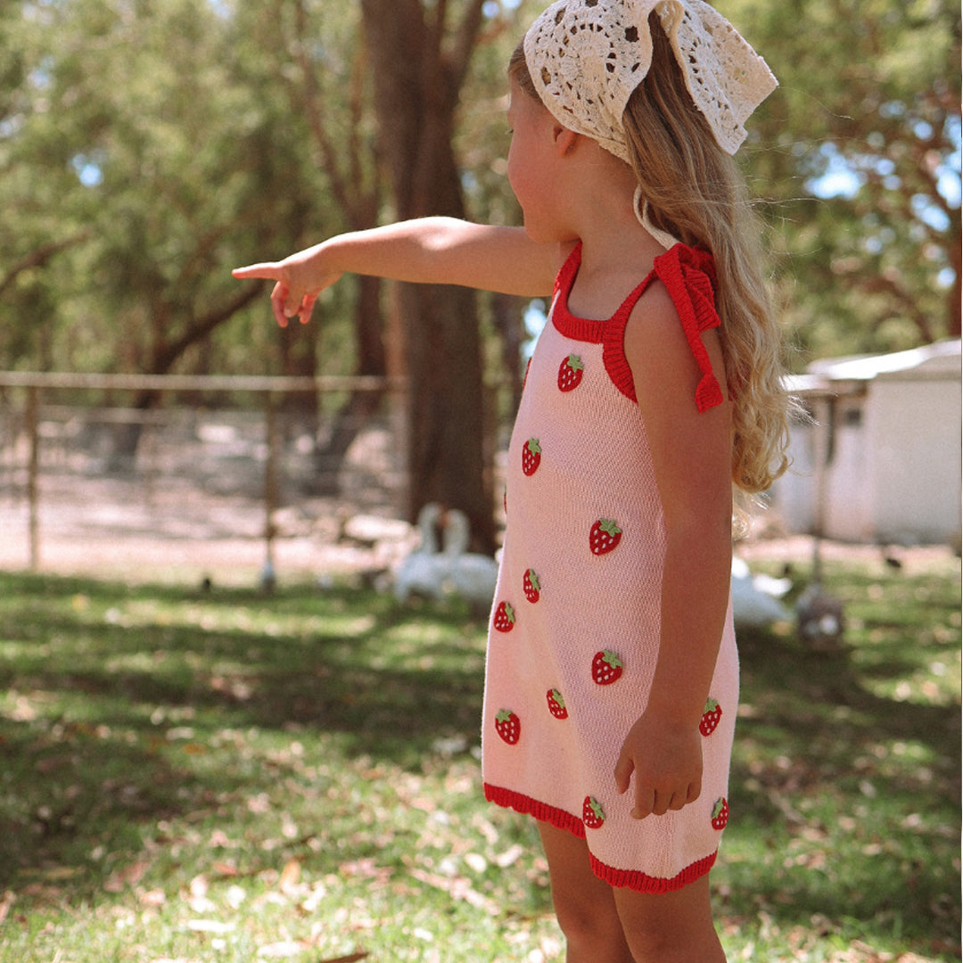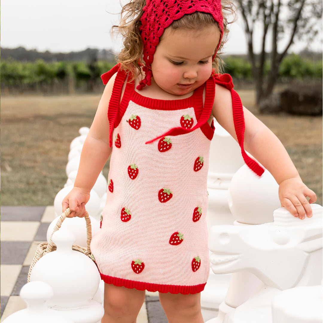 Florence Tie Dress – Strawberry Fields Sweet, playful, and bursting with charm, the Florence Tie Dress is a standout piece designed to be loved and lived in. Featuring hand-picked strawberry appliqué and finished with delicate scalloped edging along the hem, this dress is full of thoughtful details that make it truly special. Designed with ribbed cotton shoulder ties, the Florence Tie Dress is made to adjust and grow with your little one, offering comfort and longevity in one beautiful piece. Crafted from 100% cotton, it’s soft, breathable, and perfect for all-day wear.